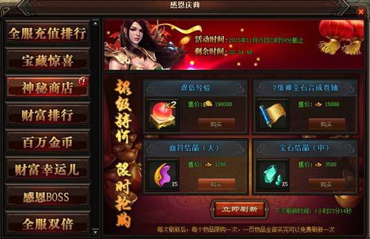 活动详情:大家最期待的神秘商店又来了哦,小伙伴们可以已使用金币、礼金、元宝在神秘商店内购买所需道具,只要399元宝就可以进行刷新,每样只能购买一次,如果这一页的购买完了可以免费刷新一次。