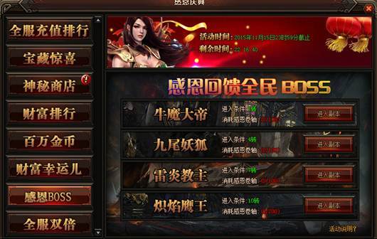 活动详情:活动期间玩家可在挂机地图里打小怪来获得感恩卷轴,例如祖玛寺庙、赤月峡谷、牛魔寺庙、魔龙城、狐月山谷、冰晶神殿、雷炎魔窟、苍月岛等都可以获得感恩卷轴,玩家获得感恩卷轴后可消耗相应卷轴进入副本,副本要求等级为1转、4转、7转、10转、想对应消耗的卷轴为100卷轴、100卷轴、100卷轴、200卷轴。BOSS会随机爆出2、4、6、8转装备不等。