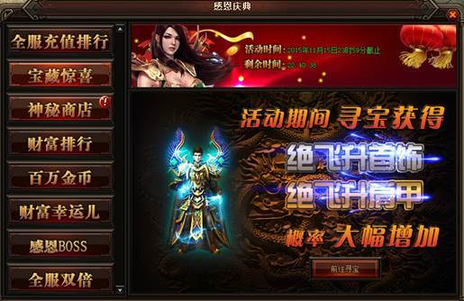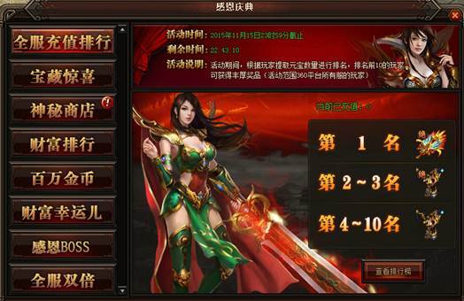 活动详情:活动期间系统会根据玩家提取的元宝数量来进行排名,此活动是按照全服的充值榜来算的,排名前10名会获得极品飞升武器、飞升衣服。奖品会在活动结束后次日通过邮件发放给玩家。