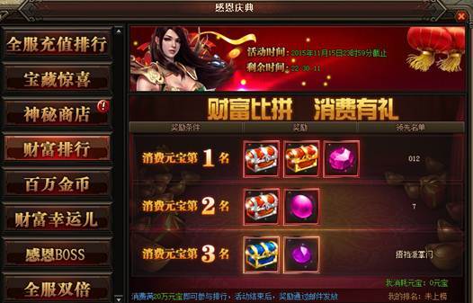 活动详情:活动期间消费满20W元宝就可以参与排行,活动结束后奖励会已邮件的方式发放给玩家,一定要记得提取~