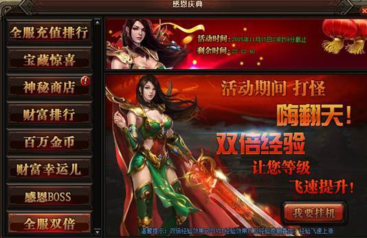 活动详情:活动期间玩家打怪挂机都可获得双倍经验,让您的等级飞速提升哦~~双倍经验与VIP经验效果及经验丸效果不冲突。