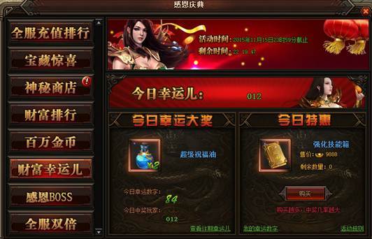 活动详情:活动期间每天0-21点可以购买特惠礼包,每服限量100个,购买特惠礼包可以获得1-100的幸运数字,数字不会重复,每天的21:00系统会随机抽取一个幸运数字,中奖的玩家将会获得该日的幸运大奖,奖品会通过邮件的方式发放给玩家。
