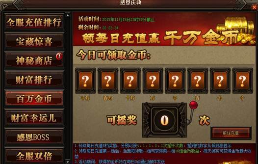 活动详情:活动期间充值领取每日充值5档奖励,分别可获得4、1、1、1、1次摇杆次数,摇杆的次数会从低到高显示,每日充值的档次后面一档都会高出前面10倍金币收益,如果一天5档的领完就可获得当天金币的最大收益,获得的金币将在每日0点通过邮件的方式发送给玩家。