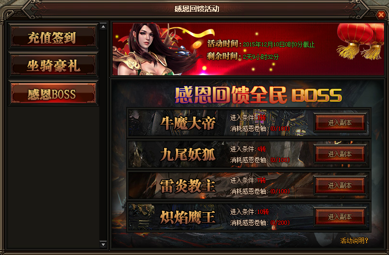 【活动说明】活动期间玩家可在挂机地图里打小怪来获得感恩卷轴,例如祖玛寺庙、赤月峡谷、牛魔寺庙、魔龙城、狐月山谷、冰晶神殿、雷炎魔窟、苍月岛等都可以获得感恩卷轴,玩家获的感恩卷轴可消耗相应卷轴进入副本,副本要求等级为1转、4转、7转、10转。相对应消耗的卷轴为100卷轴、100卷轴、100卷轴、200卷轴,BOSS会随机爆出2、4、6、8转装备不等