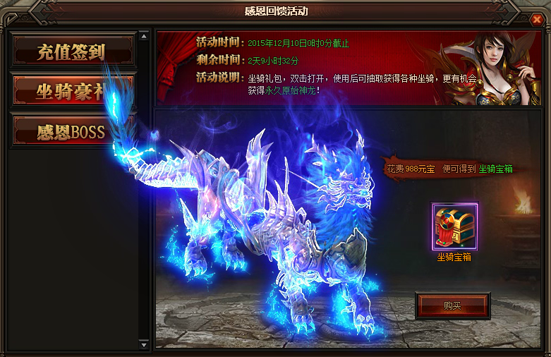 【活动说明】花费998元宝,即可得到坐骑宝箱。双击打开坐骑礼包,使用后可抽取获得各种坐骑,更有机会获得永久原始神龙!
