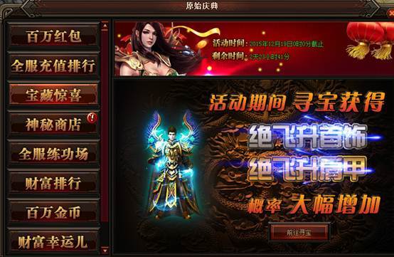 活动详情:活动期间寻宝几率增加,绝飞升首饰、护具也都有很大几率可以寻到,不要错过这个难得的机会哦~~~