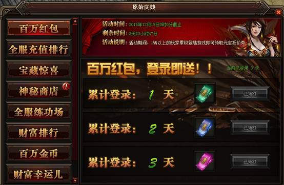 12月活动第二波。原始庆典来袭,百万金币、财富幸运儿、全服充值排行、宝藏惊喜、更有大家所期待的光翼盛宴,还在等什么,快快加入进来吧~~~~