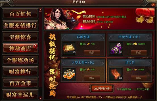 活动详情:大家最期待的神秘商店又来了哦,小伙伴们可以已使用金币、礼金、元宝在神秘商店内购买所需道具,只要399元宝就可以进行刷新,每样只能购买一次,如果这一页的购买完了可以免费刷新一次。