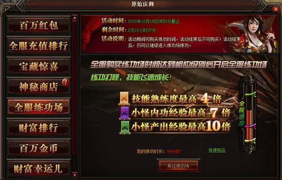 活动详情:小伙伴们是不是在为上次的练功房没有多买点时间而懊恼呢,不要桑心~~练功房又来了哦。活动期间玩家可以购买练功场时间,练功场分初级、中级、高级区域,每个区域的时间及价格不同,全服购买练功时间达到相应等级后开启全服练功场。黄色等级条要求全服购买时间为50小时、紫色等级条要求全服购买时间为500小时、绿色等级条要求全服购买时间为1500小时,每个等级所获得的奖励各不相同。
