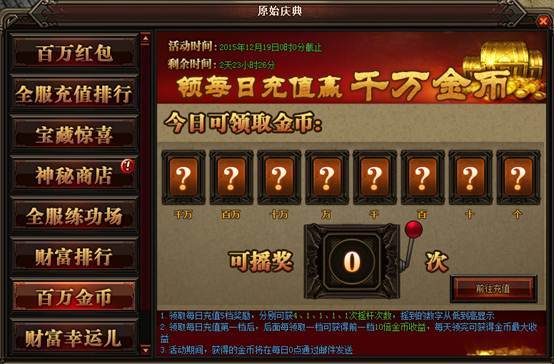 活动详情:活动期间充值领取每日充值5档奖励,分别可获得4、1、1、1、1次摇杆次数,摇杆的次数会从低到高显示,每日充值的档次后面一档都会高出前面10倍金币收益,如果一天5档的领完就可获得当天金币的最大收益,获得的金币将在每日0点通过邮件的方式发送给玩家。