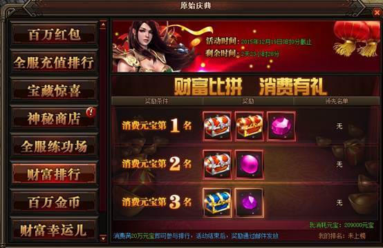 活动详情:活动期间消费满20W元宝就可以参与排行,活动结束后奖励会已邮件的方式发放给玩家,一定要记得提取~