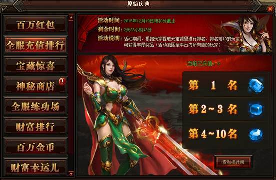 活动详情:活动期间系统会根据玩家提取的元宝数量来进行排名,此活动是按照全服的充值榜来算的,排名前10名会获得高级灵石。奖品会在活动结束后次日通过邮件发放给玩家。排名前三的玩家更有机会进入原始传奇名人堂哦。
