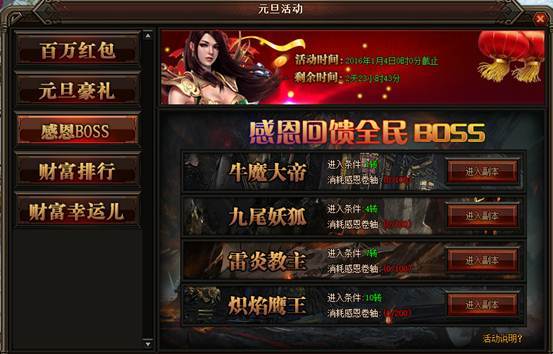活动详情:活动期间玩家可在挂机地图里打小怪来获得感恩卷轴,例如祖玛寺庙、赤月峡谷、牛魔寺庙、魔龙城、狐月山谷、冰晶神殿、雷炎魔窟、苍月岛等都可以获得感恩卷轴,玩家获的感恩卷轴可消耗相应卷轴进入副本,副本要求等级为1转、4转、7转、10转。相对应消耗的卷轴为100卷轴、100卷轴、100卷轴、200卷轴,BOSS会随机爆出2、4、6、8转装备不等。