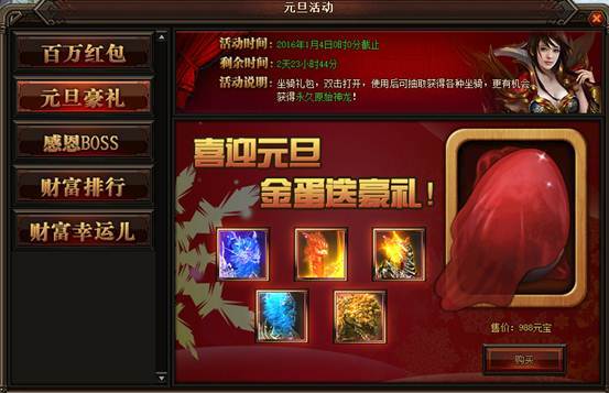 活动详情:活动期间玩家可以购买金蛋,砸蛋可获得坐骑碎片,也有几率获得极品坐骑哦。