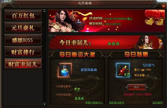 活动详情:活动期间每天0-21点可以购买特惠礼包,每服限量100个,购买特惠礼包可以获得1-100的幸运数字,数字不会重复,每天的21:00系统会随机抽取一个幸运数字,中奖的玩家将会获得该日的幸运大奖,奖品会通过邮件的方式发放给玩家。