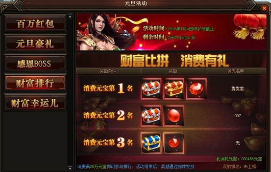 活动详情:活动期间消费满20W元宝就可以参与排行,活动结束后奖励会已邮件的方式发放给玩家,一定要记得提取~