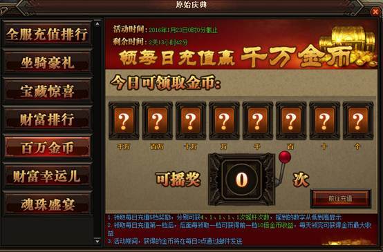 活动详情:活动期间充值领取每日充值5档奖励,分别可获得4、1、1、1、1次摇杆次数,摇杆的次数会从低到高显示,每日充值的档次后面一档都会高出前面10倍金币收益,如果一天5档的领完就可获得当天金币的最大收益,获得的金币将在每日0点通过邮件的方式发送给玩家。