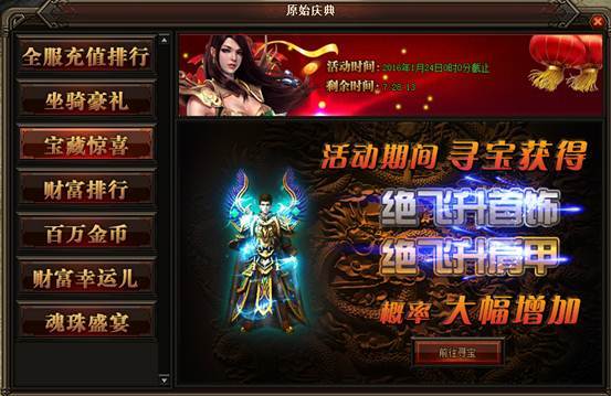 活动详情:活动期间寻宝几率增加,绝飞升首饰、护具也都有很大几率可以寻到,不要错过这个难得的机会哦~~~