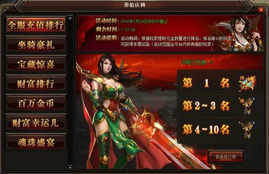 活动详情:活动期间系统会根据玩家提取的元宝数量来进行排名,此活动是按照全服的充值榜来算的,排名前10名会获得极品飞升武器、飞升衣服。奖品会在活动结束后次日通过邮件发放给玩家。