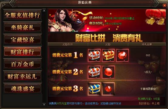 活动详情:活动期间消费满20W元宝就可以参与排行,活动结束后奖励会已邮件的方式发放给玩家,一定要记得提取~