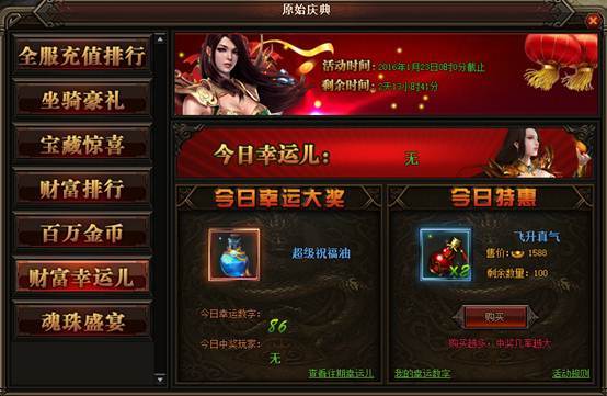活动详情:活动期间每天0-21点可以购买特惠礼包,每服限量100个,购买特惠礼包可以获得1-100的幸运数字,数字不会重复,每天的21:00系统会随机抽取一个幸运数字,中奖的玩家将会获得该日的幸运大奖,奖品会通过邮件的方式发放给玩家。
