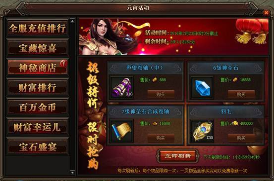活动内容:大家最期待的神秘商店又来了哦,小伙伴们可以已使用金币、礼金、元宝在神秘商店内购买所需道具,只要399元宝就可以进行刷新,每样只能购买一次,如果这一页的购买完了可以免费刷新一次。