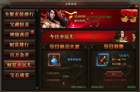 活动详情:活动期间每天0-21点可以购买特惠礼包,每服限量100个,购买特惠礼包可以获得1-100的幸运数字,数字不会重复,每天的21:00系统会随机抽取一个幸运数字,中奖的玩家将会获得该日的幸运大奖,奖品会通过邮件的方式发放给玩家。