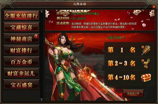 活动内容:活动期间对于所有服务器玩家提取元宝的数量进行排行,对于全服玩家在活动期间累计提取数量排名前十的玩家进行奖励。