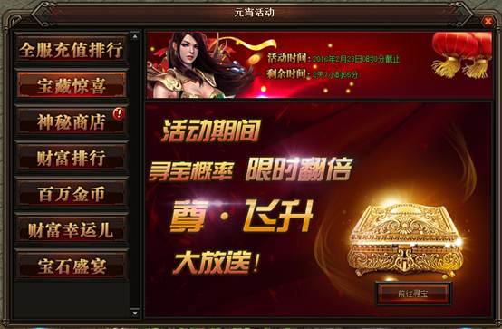 活动内容:活动期间寻宝几率增加,尊飞升装备也都有很大几率可以寻到,不要错过这个难得的机会哦~~~