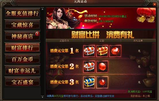 活动详情:活动期间消费满20W元宝就可以参与排行,活动结束后奖励会已邮件的方式发放给玩家,一定要记得提取~