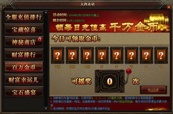 活动详情:活动期间充值领取每日充值5档奖励,分别可获得4、1、1、1、1次摇杆次数,摇杆的次数会从低到高显示,每日充值的档次后面一档都会高出前面10倍金币收益,如果一天5档的领完就可获得当天金币的最大收益,获得的金币将在每日0点通过邮件的方式发送给玩家。