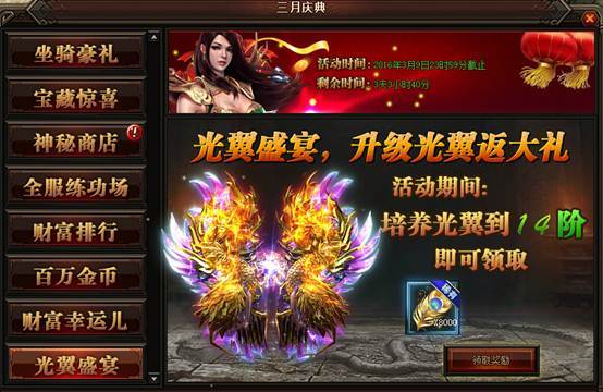 活动详情:光翼盛宴,升级光翼返大礼,活动期间只要升级光翼就可以获得返利羽毛,返利的羽毛是有时间限制的,使用期为三天,要及时使用哦。