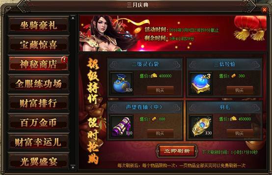 活动详情:大家最期待的神秘商店又来了哦,小伙伴们可以已使用金币、礼金、元宝在神秘商店内购买所需道具,只要399元宝就可以进行刷新,每样只能购买一次,如果这一页的购买完了可以免费刷新一次。