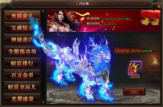 活动详情:活动期间玩家可以购买坐骑宝箱,开启宝箱可获得坐骑碎片,也有几率获得完整坐骑哦。开宝箱获得的坐骑碎片是直接发放到背包里的。