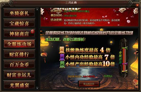 活动详情:小伙伴们是不是在为上次的练功房没有多买点时间而懊恼呢,不要桑心~~练功房又来了哦。活动期间玩家可以购买练功场时间,练功场分初级、中级、高级区域,每个区域的时间及价格不同,全服购买练功时间达到相应等级后开启全服练功场。黄色等级条要求全服购买时间为50小时、紫色等级条要求全服购买时间为500小时、绿色等级条要求全服购买时间为1500小时,每个等级所获得的奖励各不相同。