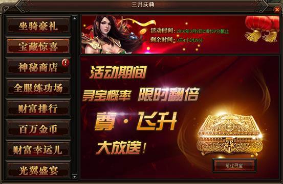 活动详情:活动期间寻宝几率增加,尊飞升也都有很大几率可以寻到,不要错过这个难得的机会哦~~~