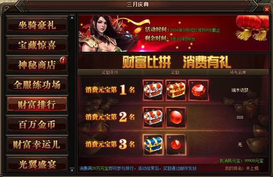 活动详情:活动期间消费满20W元宝就可以参与排行,活动结束后奖励会已邮件的方式发放给玩家,一定要记得提取~