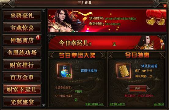 活动详情:活动期间每天0-21点可以购买特惠礼包,每服限量100个,购买特惠礼包可以获得1-100的幸运数字,数字不会重复,每天的21:00系统会随机抽取一个幸运数字,中奖的玩家将会获得该日的幸运大奖,奖品会通过邮件的方式发放给玩家。