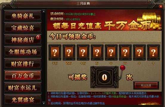 活动详情:活动期间充值领取每日充值5档奖励,分别可获得41111次摇杆次数,摇杆的次数会从低到高显示,每日充值的档次后面一档都会高出前面10倍金币收益,如果一天5档的领完就可获得当天金币的最大收益,获得的金币将在每日0点通过邮件的方式发送给玩家。