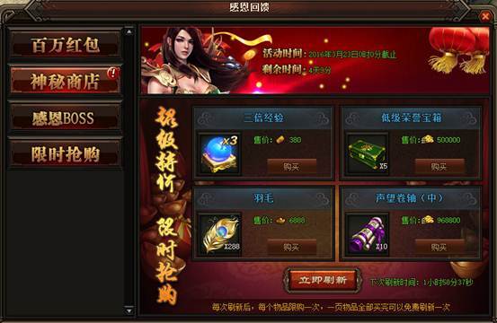 活动详情:动期间玩家可以在神秘商店低价购买自己所需要的道具,每消耗399元宝可刷新一次,刷新后道具栏里会随机刷出不同的道具,玩家可以消耗点劵、金币、元宝来进行购买。