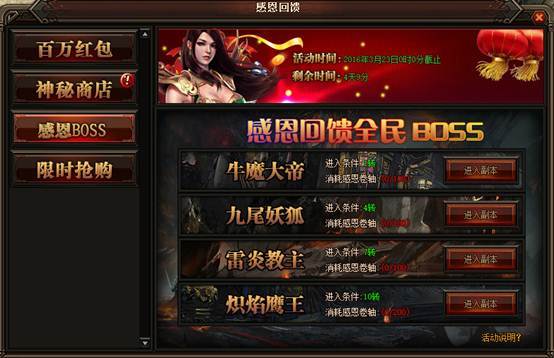 活动详情:活动期间玩家可在挂机地图里打小怪来获得感恩卷轴,例如祖玛寺庙、赤月峡谷、牛魔寺庙、魔龙城、狐月山谷、冰晶神殿、雷炎魔窟、苍月岛等都可以获得感恩卷轴,玩家获的感恩卷轴可消耗相应卷轴进入副本,副本要求等级为1转、4转、7转、10转。相对应消耗的卷轴为100卷轴、100卷轴、100卷轴、200卷轴,BOSS会随机爆出2、4、6、8转装备不等
