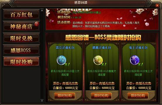 活动详情:活动期间玩家可以以超低的折扣价格购买豪华礼包,每种礼包每个玩家只能购买一次,小伙伴们不要错过哦。