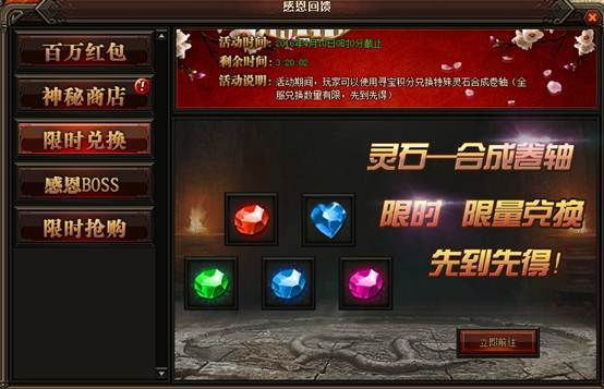 活动详情:活动期间,玩家可以使用寻宝积分兑换特殊灵石合成卷轴(全服兑换数量有限,先到先得)