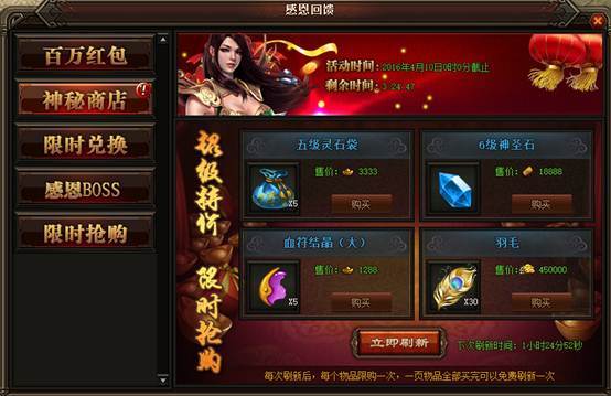活动详情:大家最期待的神秘商店又来了哦,小伙伴们可以已使用金币、礼金、元宝在神秘商店内购买所需道具,只要399元宝就可以进行刷新,每样只能购买一次,如果这一页的购买完了可以免费刷新一次。