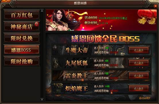 活动详情:活动期间玩家可在挂机地图里打小怪来获得感恩卷轴,例如祖玛寺庙、赤月峡谷、牛魔寺庙、魔龙城、狐月山谷、冰晶神殿、雷炎魔窟、苍月岛等都可以获得感恩卷轴,玩家获得感恩卷轴后可消耗相应卷轴进入副本,副本要求等级为1转、4转、7转、10转、想对应消耗的卷轴为100卷轴、100卷轴、100卷轴、200卷轴。BOSS会随机爆出2、4、6、8转装备不等。