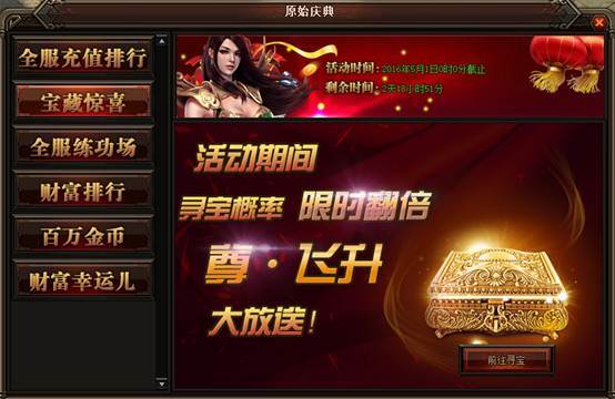活动详情:活动期间寻宝概率限时翻倍哦,各种极品装备、道具等你来拿,更有尊·飞升大放送,千万不要错过哦~~