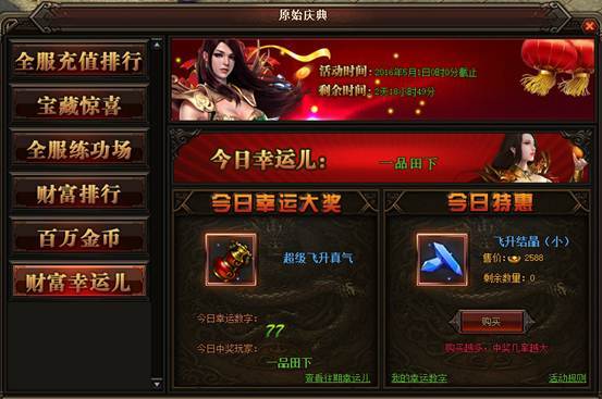 活动详情:活动期间玩家可在今日特惠里以优惠的价格购买相应的道具,每购买一次便可获得相应的一个幸运数字。系统会随机抽取一个幸运数字,每日21:00开奖,如果被系统抽到的幸运玩家就可获得今日幸运大奖,数量有限先到先得。