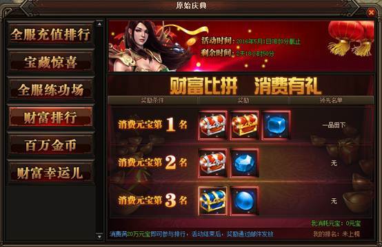 活动详情:活动期间消费满20W元宝就可以参与排行,活动结束后奖励会已邮件的方式发放给玩家,一定要记得提取~