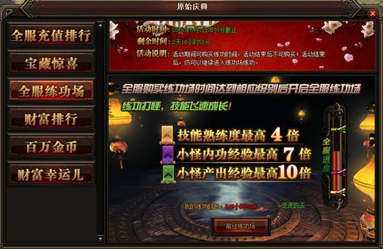 活动详情:小伙伴们是不是在为上次的练功房没有多买点时间而懊恼呢,不要桑心~~练功房又来了哦。活动期间玩家可以购买练功场时间,练功场分初级、中级、高级区域,每个区域的时间及价格不同,全服购买练功时间达到相应等级后开启全服练功场。黄色等级条要求全服购买时间为50小时、紫色等级条要求全服购买时间为500小时、绿色等级条要求全服购买时间为1500小时,每个等级所获得的奖励各不相同。