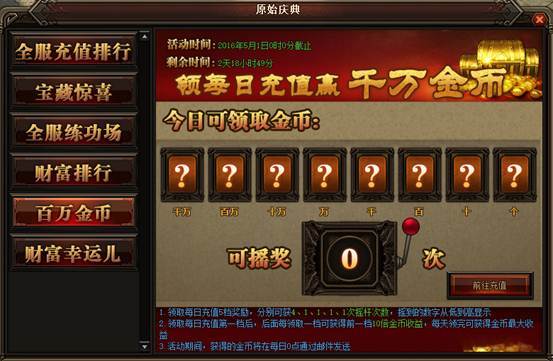 活动详情:活动期间充值领取每日充值5档奖励,分别可获得4、1、1、1、1次摇杆次数,摇杆的次数会从低到高显示,每日充值的档次后面一档都会高出前面10倍金币收益,如果一天5档的领完就可获得当天金币的最大收益,获得的金币将在每日0点通过邮件的方式发送给玩家。